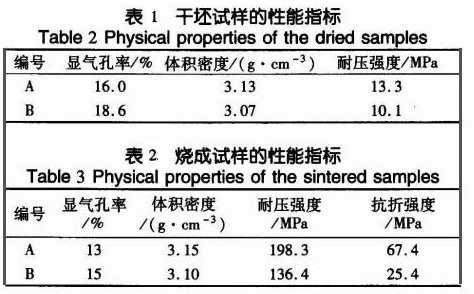 實驗所用原料為棕剛玉、白剛玉、碳化硅、硅粉等。在實驗中設計A、B兩種配方,其中A為硅—(白剛玉+棕剛玉)—碳化硅質,B為棕剛玉—碳化硅質。在混碾機中混合均勻后成型,成型壓力為350MPa。將試樣分成兩批,第一批只在110℃,24h烘干后即測量其顯氣孔率、體積密度、常溫耐壓強度;另一批烘干后再電爐中于1500℃保溫6h 燒成。自然冷卻后測量其顯氣孔率、體積密度、常溫耐壓強度和常溫抗折強度,進行載荷-變形實驗。